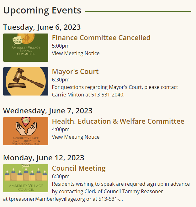Amberley Village Council meets on the second Monday of each month (unless there is a conflict). The next meeting is scheduled for Monday, June 12, 2023 at 6:30 pm in Council Chambers at the Municipal Building, located at 7149 Ridge Road.