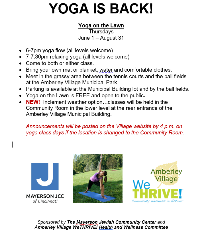 Amberley Village WeTHRIVE! Health & Wellness Committee is proud to host the return of Tuesday Night Pickup Pickleball. Join fellow Village pickleball enthusiasts from 6:30 - 8 p.m. on Tuesday evenings through August. In case of inclement weather, meet at the Mayerson JCC at 7:00 p.m.