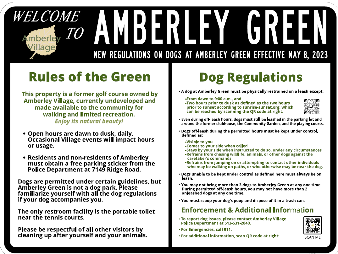 At the May 8 meeting of council, Amberley Village Council approved minor changes to dog regulations at Amberley Green, expanding off-leash hours for dogs to include two hours prior to dusk vs. the current one hour prior to dusk.
