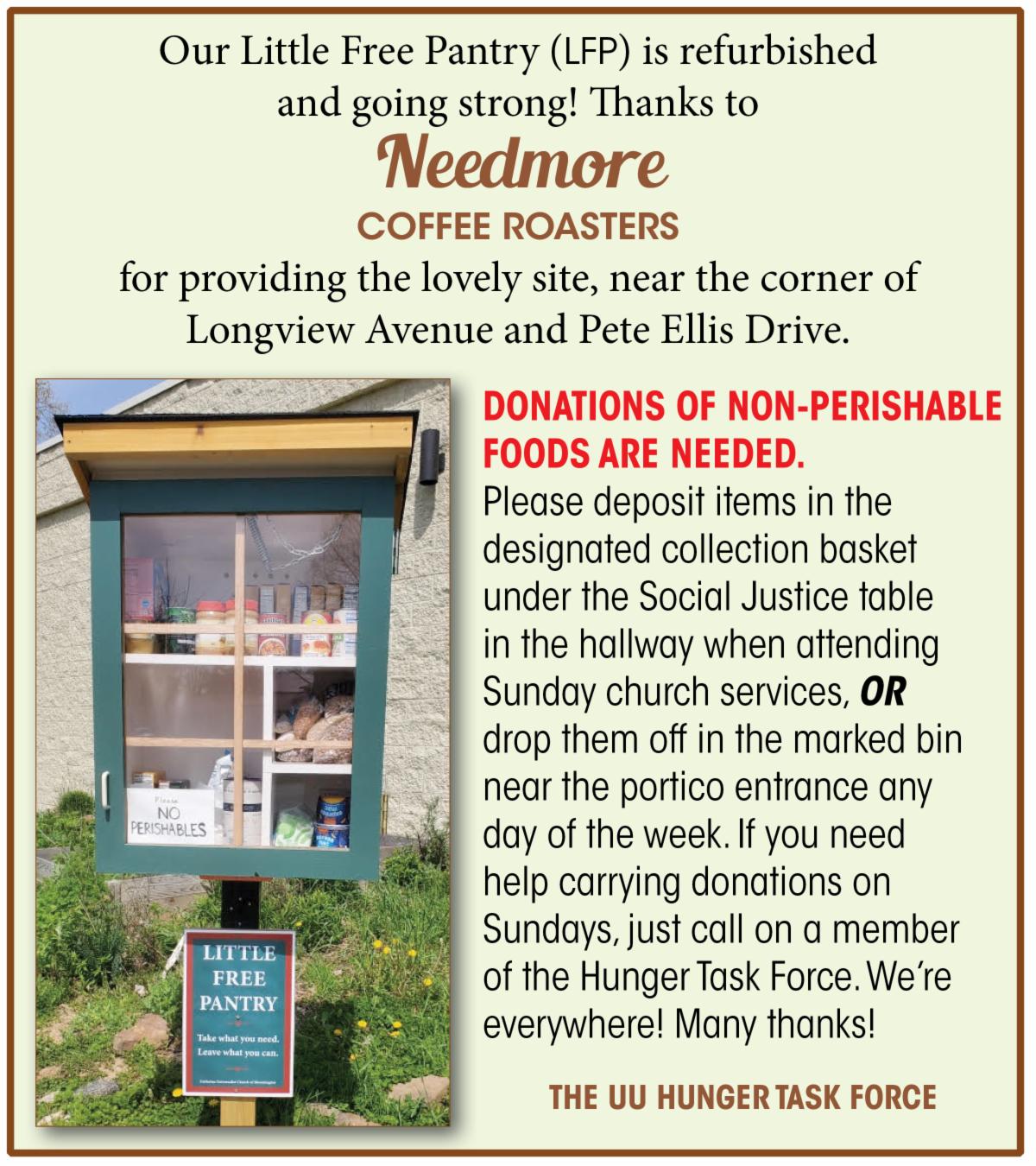 We’re looking for donations of toys, games, household goods and decor, clothing, books, tools, dishes, pots and pans, and any items you think people would like to buy. Sale tables are 10’ X 10’, so we can’t take really large items, but feel free to call first to check. Please bring items you can contribute to UU on Aug. 6 and put them in Room 110 from 9 a.m. to 1 p.m. Labeling them with a recommended price would be helpful, but not essential. If you have questions or can’t bring them on that date, contact Christine Banister at christine.e.banister@gmail.com or text her at 812-343-8842.