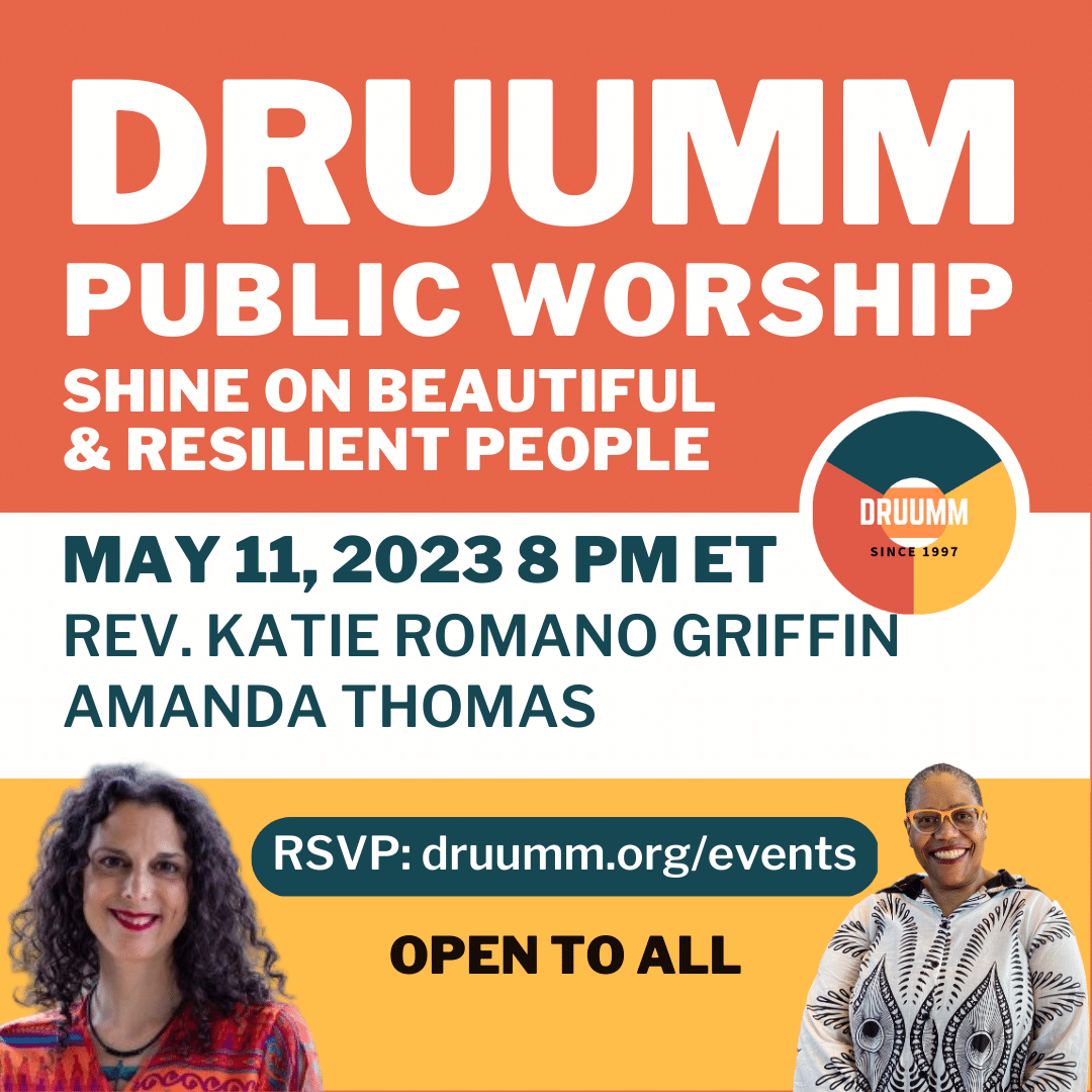 DRUUMM (Diverse & Revolutionary UU Multicultural Ministries) is Unitarian Universalism’s oldest and largest People of Color collective. Join DRUUMM for their annual public worship featuring a festival of Black and Brown joy and resilience. Musical director Amanda Thomas and guest minister Rev. Katie Romano Griffin (from All Souls in Indianapolis) are joined by gifted black and brown colleagues from across the UU-verse to help bring some shine to your day including The Rev. Dr. Kristen Harper, Nasreen Khan, and Cassie Montenegro. Featuring original works of music, prayer, and poetry. Register here.