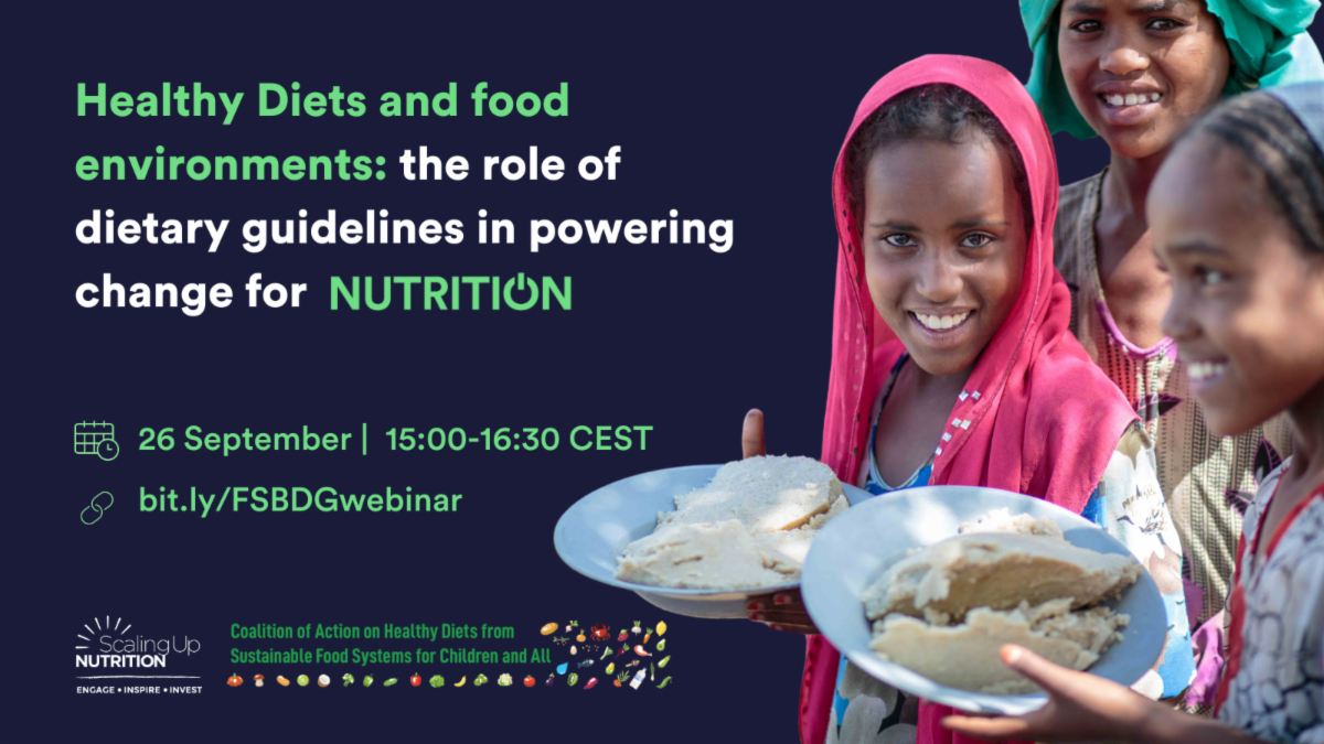 The Coalition of Action for Healthy Diets from Sustainable Food Systems (HDSFS) in partnership with the Scaling Up Nutrition (SUN) Movement are hosting a webinar on 26 September 2024, from 15:00-16:30 CEST. As part of the preparations for the SUN Global Gathering in Kigali, Rwanda, in November, the session will include coalition member countries and academic partners and will explore how dietary guidelines can promote healthy diets from sustainable food systems and introduce a new FAO methodology for food systems-based dietary guidelines. | | |