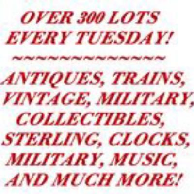 Coins, Cast Iron, Gold & Sterling Jewelry, Bronzes, Musical Instruments, Costume Jewelry, Trains, Models, Fraternal Items, Clocks and Watches, Military, Fine China, Oriental Items, Cameras, Vintage Advertising, Porcelain/Enamel Signs, Paintings/Prints, Folk Art, Buddy L/Nylint/Structo, Matchbox/Hot Wheels, Legos, Tonkas, Rugs, Sewing Machines, Lighting/Lamps, Primitives, Sports Memorabilia, Vintage Photos,Locks/Keys, Knives and Lighters, Figurines and Sculptures, Toys, Dolls, Bicycles, Ephemera, Taxidermy, Fishing Items, Tools, Jugs and Crocks, Nautical/Maritime Items, Auto Related, Electronics, Seasonal Items, Cement/Garden Items, Antique Furniture, Tobacco/Smoking Paraphernalia, Ink Well/Writing Instruments/Fountain Pens Waterman/Sheaffer, Pottery/Glass/Crystal, Football, Baseball, Basketball, Boxing Memorabilia and other items are auctioned singly or by lots.