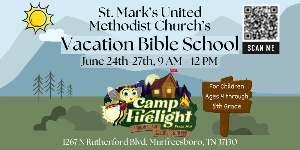 St. Mark’s Vacation Bible School will be June 24-27 from 9 AM – 12 PM. This year’s theme is Camp Firelight! Children ages 4 through 5th grade and younger children of VBS volunteers are welcome to attend. Click here to register your child for an unforgettable summer camp adventure with God!