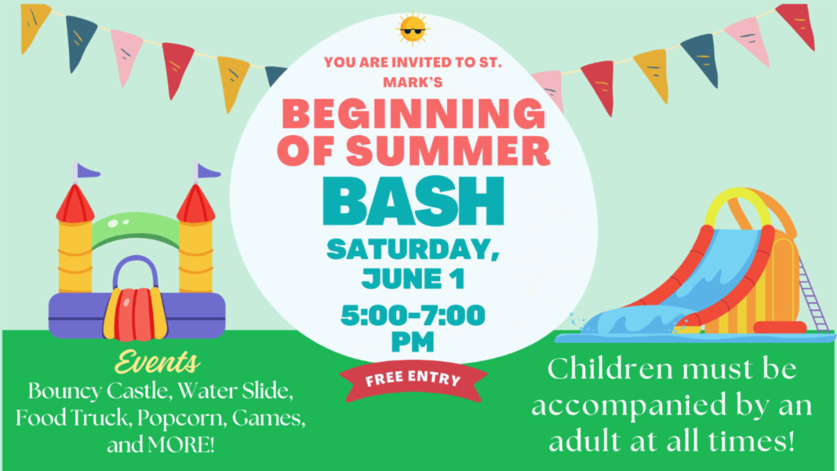 SAVE THE DATE: St. Mark’s Children’s Ministry will be hosting its Beginning of Summer Bash at St. Mark’s from 5-7 pm on Saturday 6/1, and Youth & Families are both invited to this event. There will be a waterslide, food trucks, popcorn, games and more! Also, Youth Helpers are requested at 4 pm to set up games, etc. Please let me know if you are willing to volunteer your time to help with this event!