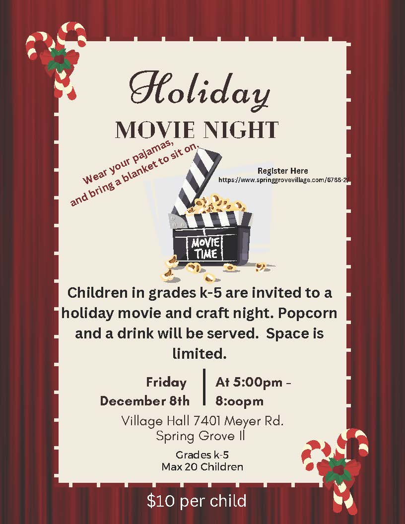 Need a couple hours to get some holiday shopping done? Children in grades K-5 are invited to a holiday movie and craft night. This Friday, December 8th from 5:00 -8:00 p.m. at the Spring Grove Municipal Centre located at 7401 Meyer Rd. $10.00 per child. Popcorn and a drink will be served. Space is limited, sign up here, click here for the flyer.