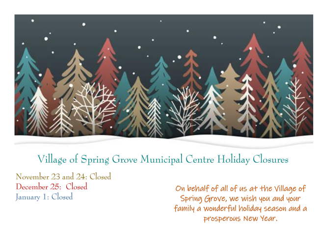 The Village Hall located at 7401 Meyer Road is a warming center with power and is open to the public between the hours of 8:00am to 4:00pm. The Spring Grove Fire Department, located at 8214 Richardson Road is a warming center that is open 8:00a.m.-4:00p.m.