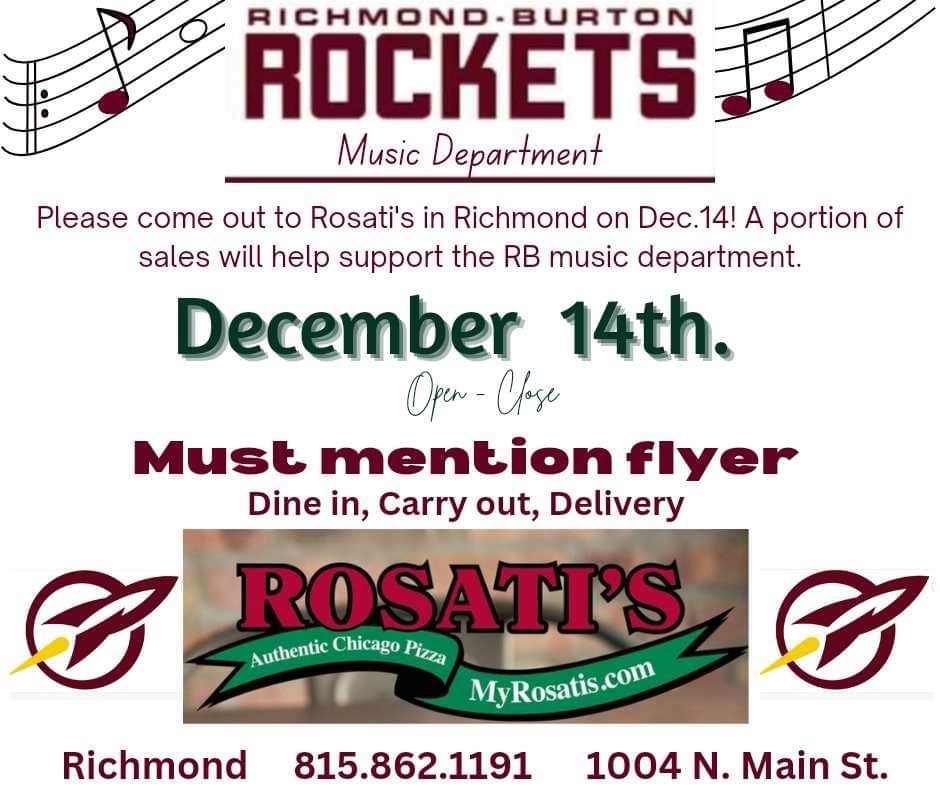 Please come out to Rosati's in Richmond next Thursday, December 14th to help raise funds for the Richmond-Burton Rockets Music Department. Dine in, carry out, and delivery are all available when their flyer is mentioned.