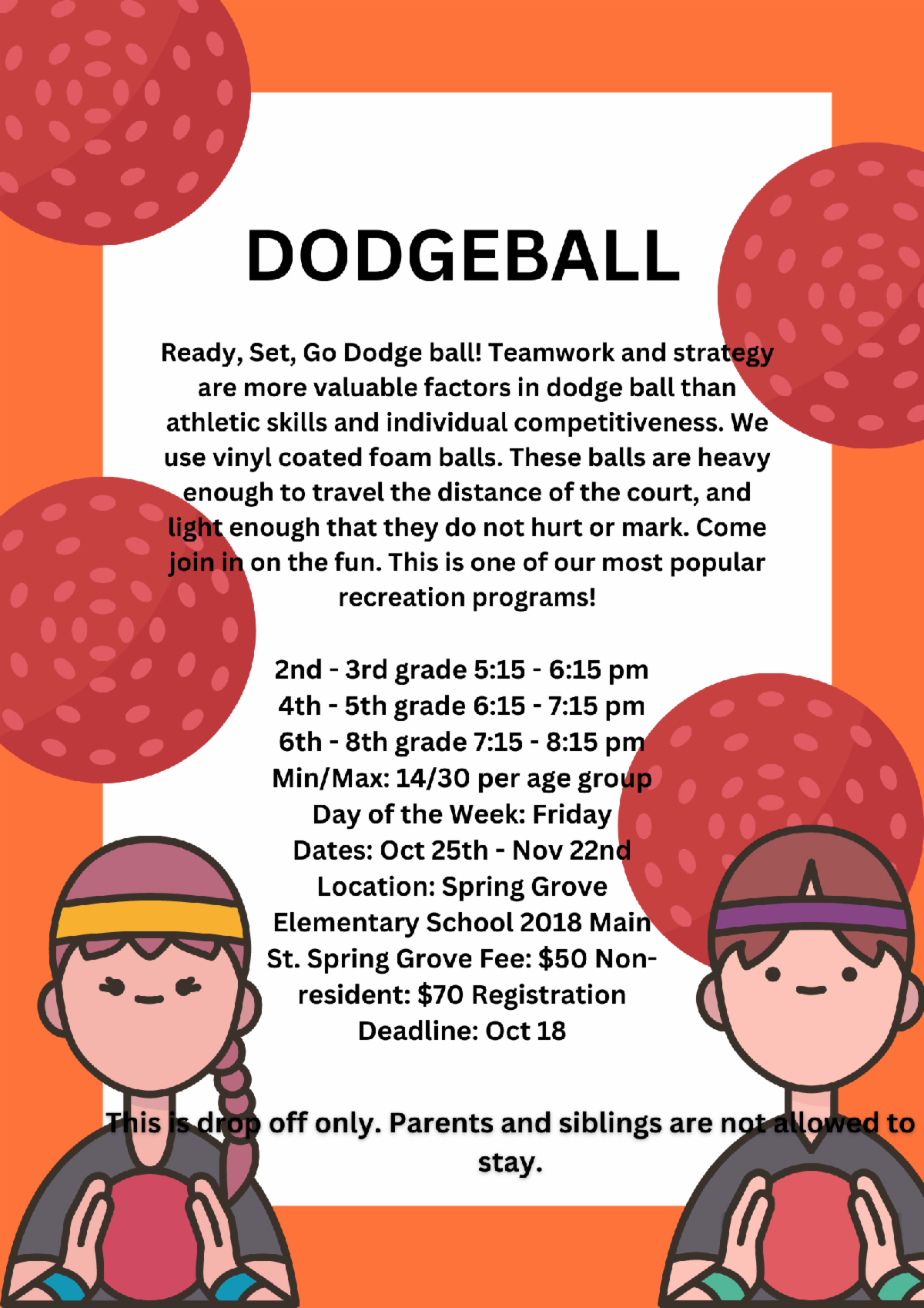Deadline October 18. Program runs Fridays from October 27 - December 1 (excluding November 24). This program will be held at Spring Grove Elementary 2018 Main Street. Space is limited to participants only. Click HERE to register.