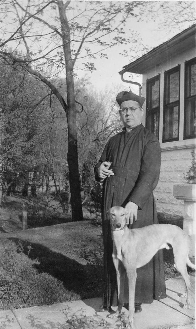 There seems to be no old photo of the front of 2206 Main Street, except for the one with Father Daleiden standing in front of the porch with his cigar and whippet dog. But the brick sides of the original building can still be seen along with the original window openings. Surrounded by lush gardens, lawns, and towering old trees, the setting could not be more beautiful or peaceful for the old rectory.