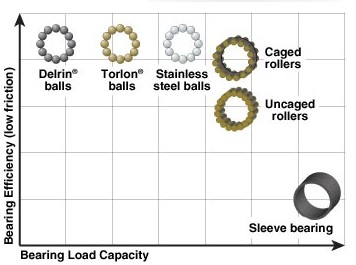 Ball bearings: Very low friction; low/medium load capacity. (Small boat blocks, Carbo)