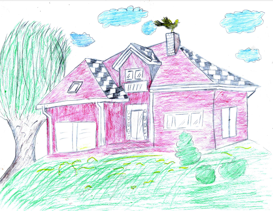 NOTE: The younger daughter of the family we sponsor drew this picture of “my new home.” The bird on the chimney represents freedom.