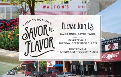 Savor the Flavor is a walking tasting tour of area restaurants. The sampling begins along Dickson Street in Fayetteville at 5:00 p.m. on Tuesday, September 8 and then around Downtown Bentonville at 5:00 p.m. on Thursday, September 17. Proceeds benefit Faith In Action, a service of Washington Regional Medical Foundation, providing free non-medical services to homebound seniors in Washington and Benton counties.
