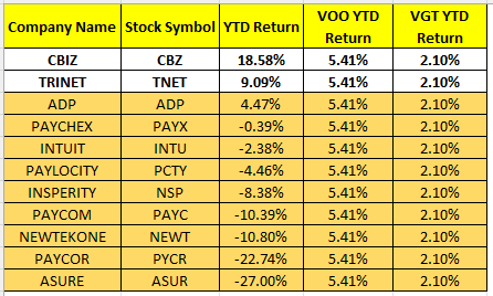 Listed below is a year-to-date ROI* chart for the payroll stocks listed above via YTDreturn.com.