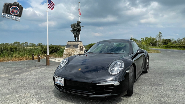 Photo by Paul Merrick. Chicago Region. "This is a photo of my 2013 Porsche 911 Carrera S in front of a statue of Major Richard Winters, next to the Normandy field where he and his Band of Brothers landed on June 6, 1944.