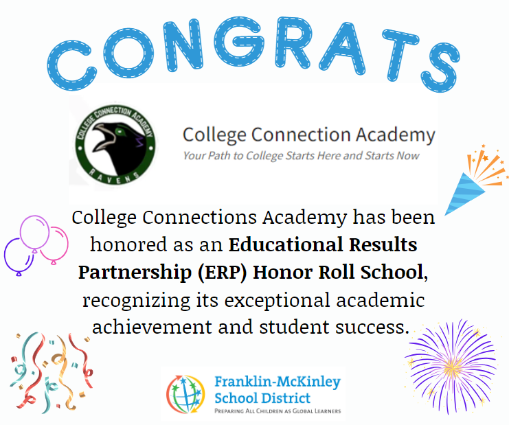 Congratulations! College Connections Academy has been honored as an Educational Results Partnership (ERP) Honor Roll School, recognizing its exceptional academic achievement and student success.