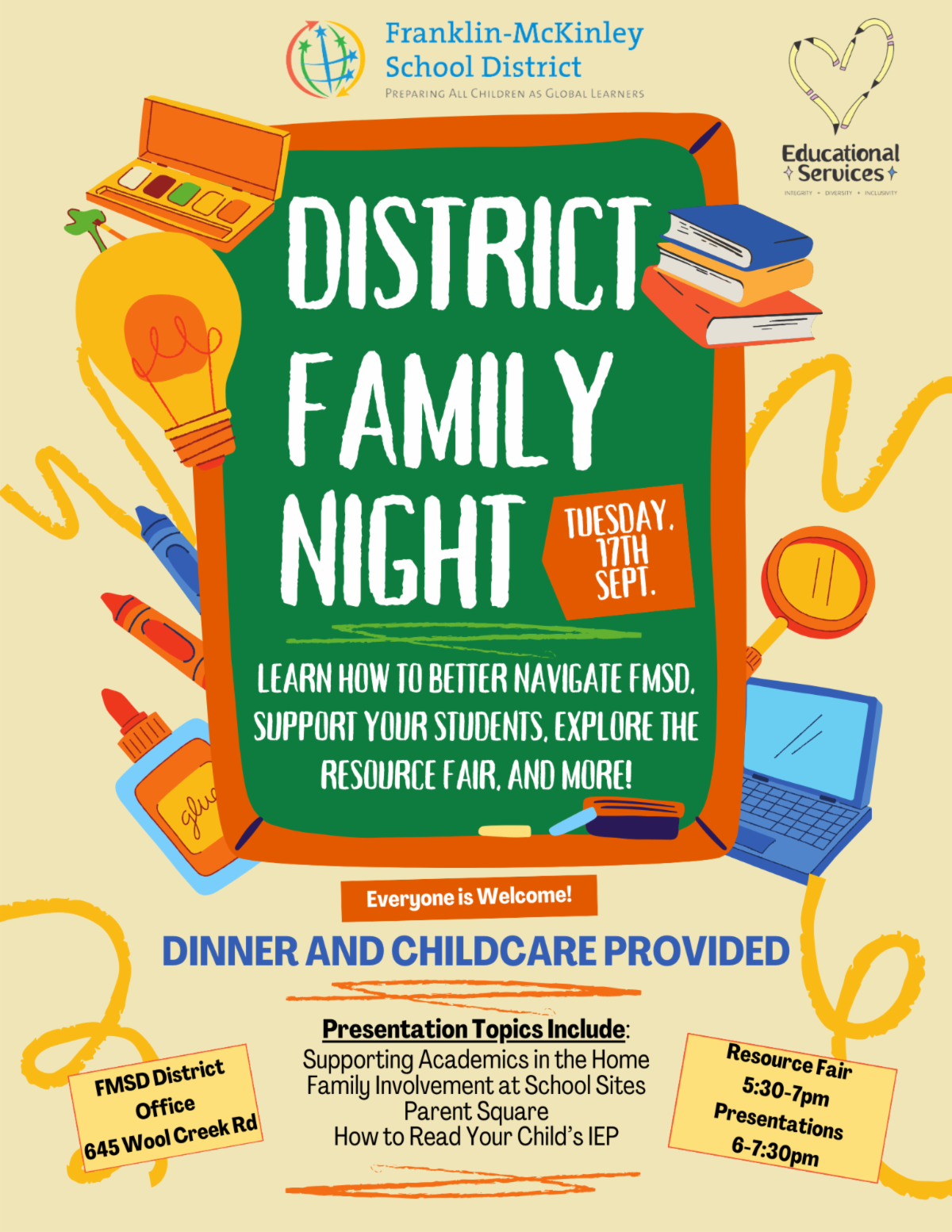 Come learn how to navigate FMSD at our first district Family Night of the year on Tuesday. September 17, 2024! Learn how to best support your students with homework, how to use parent square, how to get more involved at school and in the district, and any information about Special Education. We will have a resource fair with our community partners, dinner provided by our Child Nutrition Services department, and free childcare. Come and learn about our district! | |