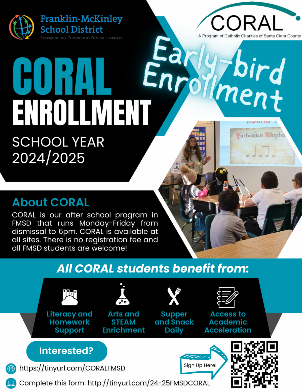 CORAL is our after-school program. The Franklin-McKinley School District has partnered with Catholic Charities of Santa Clara County to provide expanded learning programs to students across the District. Catholic Charities offers the CORAL program at all FMSD sites for all students, free of cost, Monday through Friday from dismissal to 6 pm. All CORAL students benefit from: