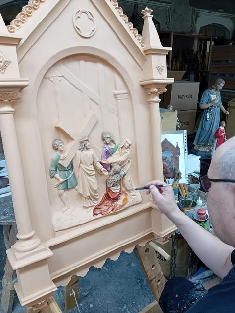 Curious about the progress of our Stations of the Cross for the church? Here is a photo of one of them being painted, and they are much farther along than what you see here. We expect them in the coming weeks!