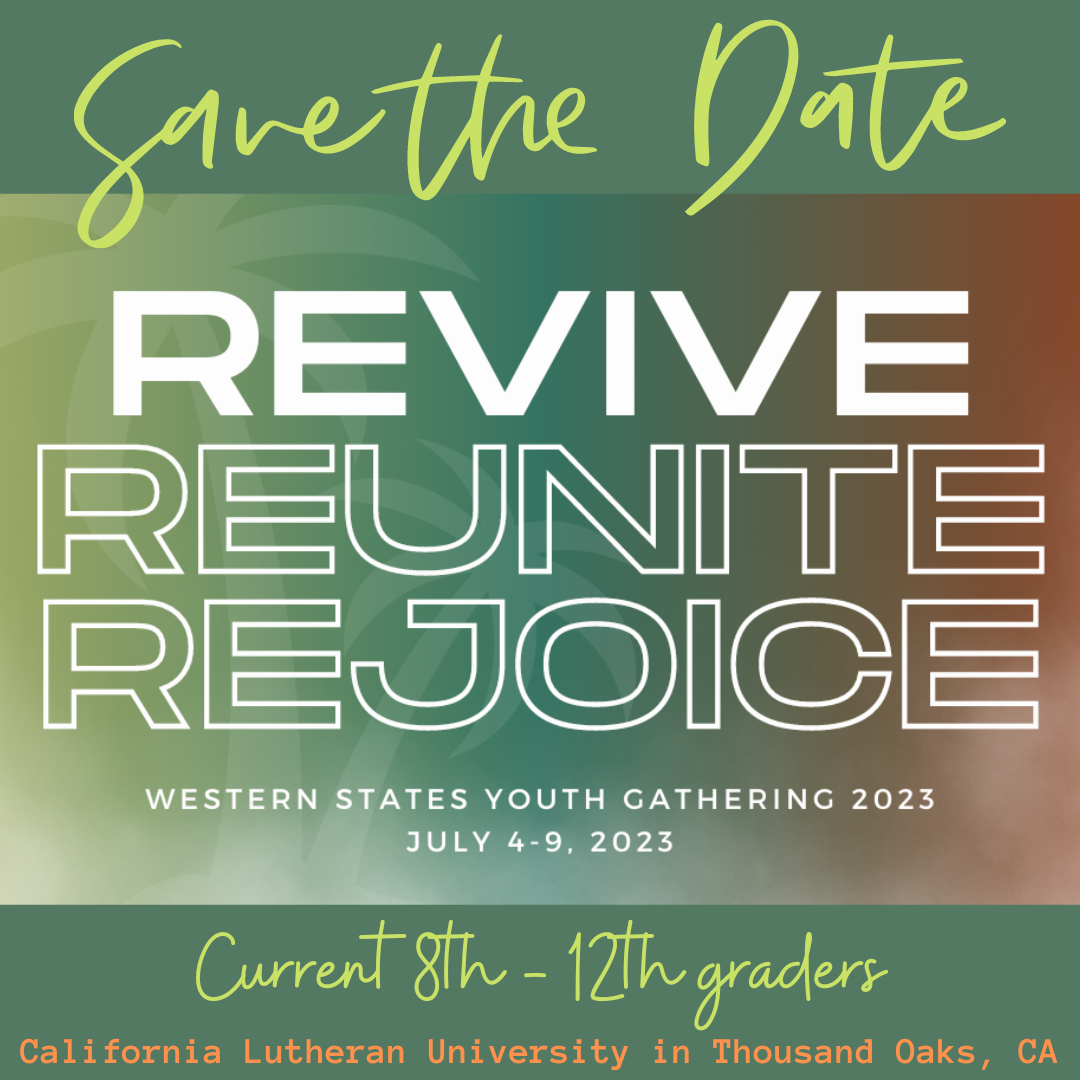 The Western States Youth Gathering (WSYG) and Western States Multicultural Youth Leadership Event (WYLE) is coming to California Lutheran University in Thousand Oaks, CA from July 4-9, 2023 and is open to high school aged youth in Regions 1-4. The Western States Multicultural Youth Leadership Pre-Event (WYLE) will be held July 4-6, 2023. WSYG and WYLE will gather around the theme, “Revive, Reunite, Rejoice”, grounded in Acts 2:1 “When the day [of WSYG] came, they were all together in one place.”