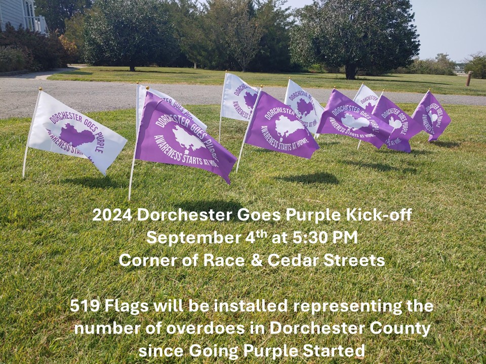 DGP will be installing a flag display at the Corner of Race St and Cedar St in Cambridge, MD. There will be 519 flags representing the number of overdoes in Dorchester County since the Going Purple movement was stated. 85 of those flags will be white representing those overdoes that resulted in a fatality.
