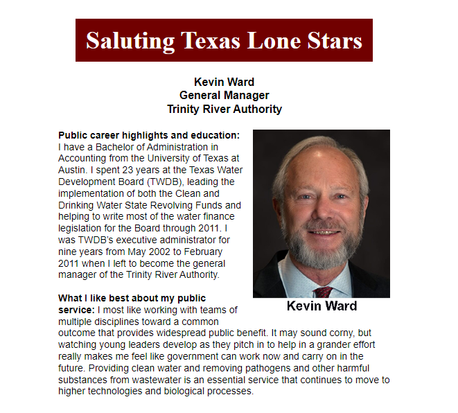 Former Southern Region Executive Manager, Jim Sims, was honored with a Lifetime Membership Award by the Texas Water Conservation Association at its annual meeting in March. This award recognizes Sims for his distinguished and outstanding dedication, service and contribution to the Association and Texas water resource management. Sims retired from the Trinity River Authority in 2023 after 50 years of service.